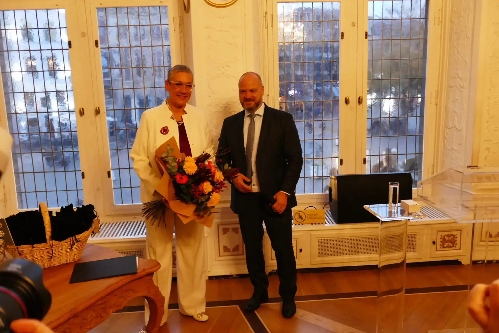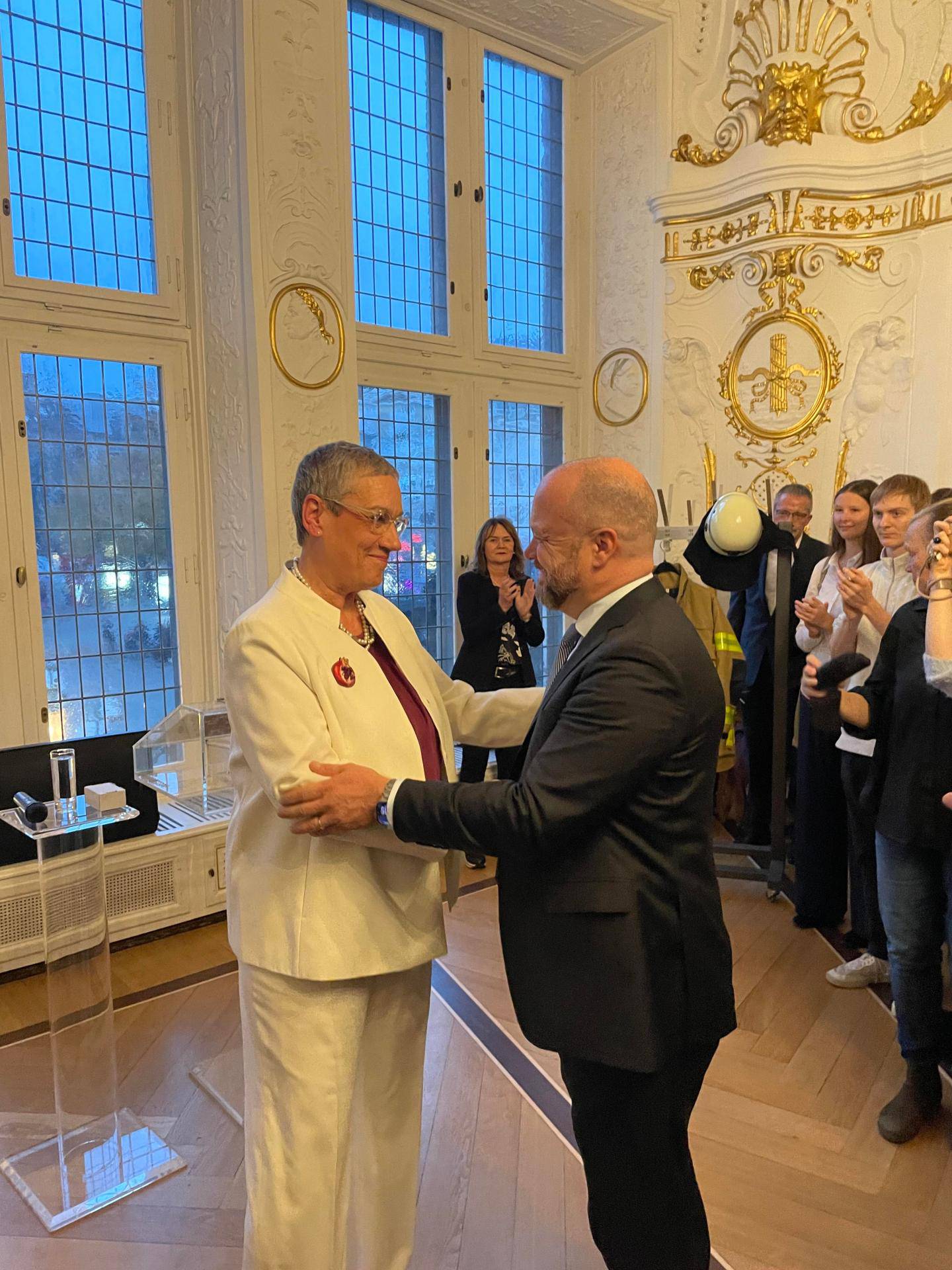 Zu den symbolischen Momenten der Übergabe gehörten die Amtskette, die traditionsgemäß den Tisch im Weißen Saal zierte, sowie die Uniform des obersten Feuerwehrleiters und die ersten Visitenkarten für den neuen Oberbürgermeister.
